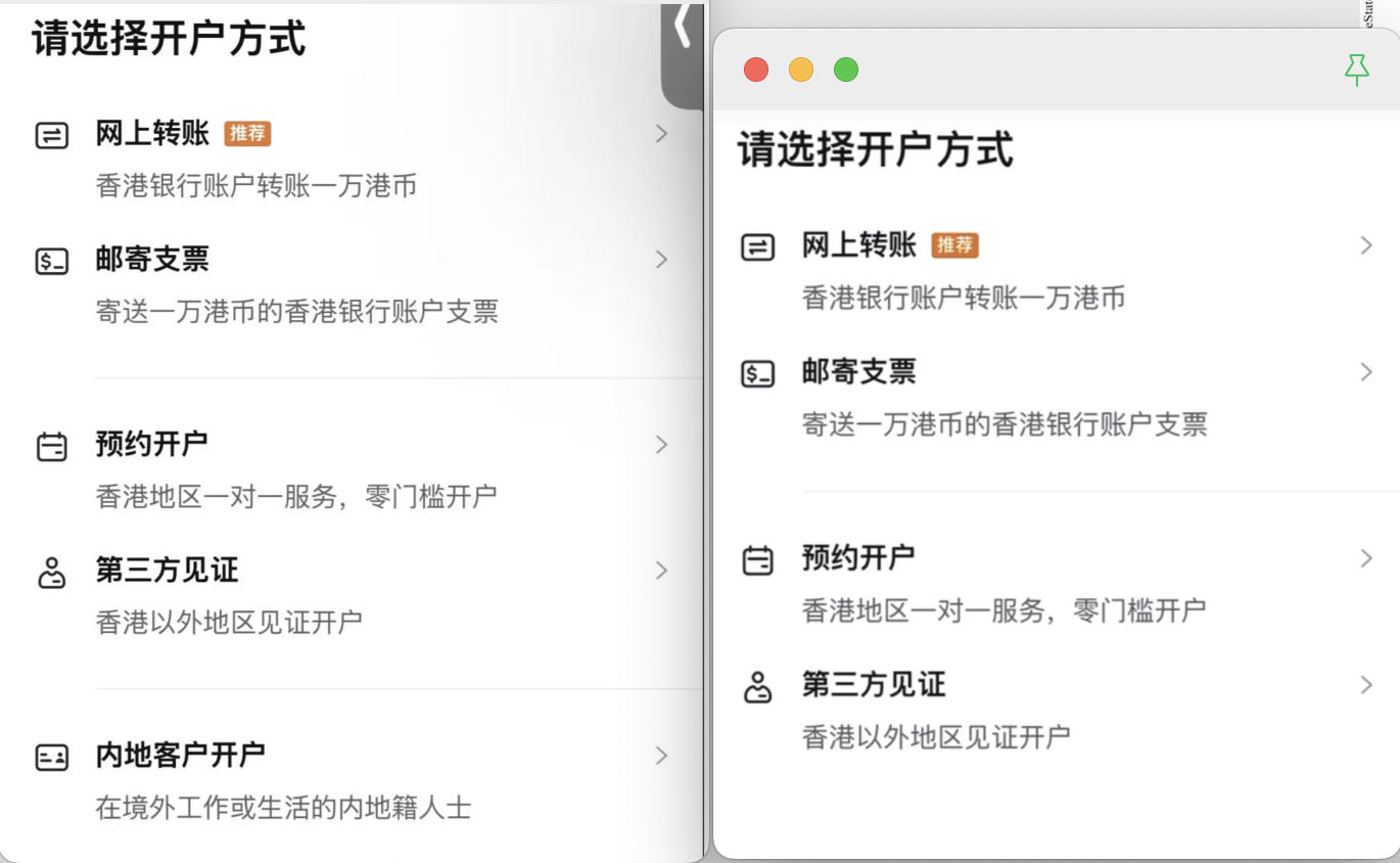 简单说,先上关键途,左边是之前的,右图是更新之后的。这个是富途最新的开户流程更新。也就在昨天, 内地客户开户的选项被下架了。